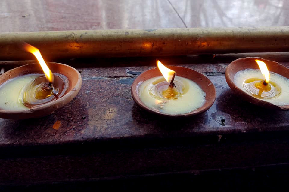 Diyas (clay lamps) offered by Kar sit in front of the shrine dedicated to Ragnya Devi. As soon as she put her head down to pray, Kar said prayers from a nearby mosque began to blare through a loudspeaker, disrupting her train of thought. “It was like a really disturbing feeling,” Kar said. “It was a very negative emotion, because it felt like they could have built a mosque somewhere else…”