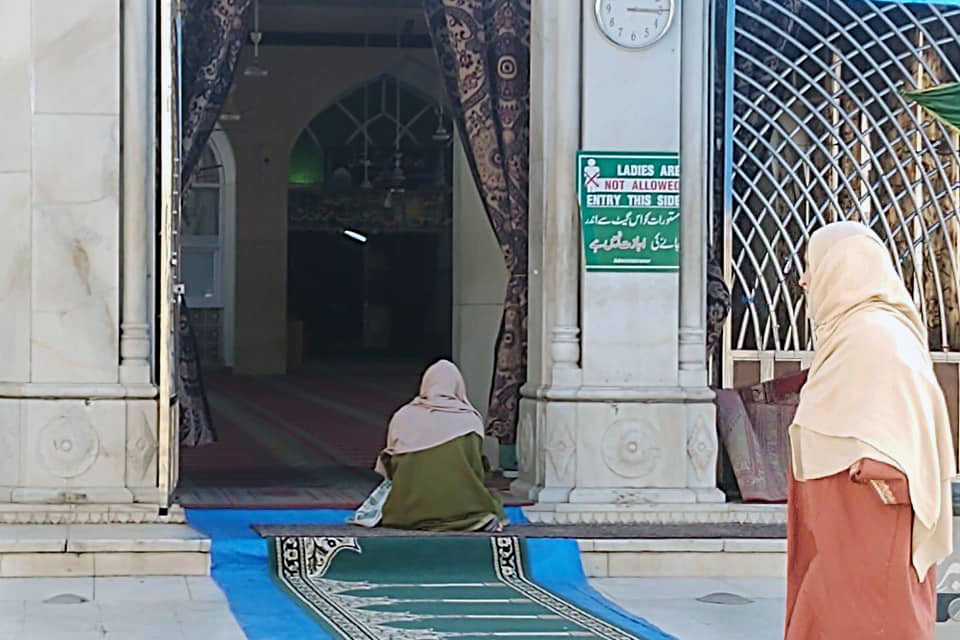 Two Muslim women look into Hazratbal Shrine from the outside, as ladies are explicitly not allowed in through the main entrance.
