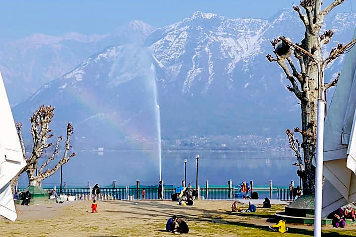 Outside of Hazratbal Shrine, people relax to a picturesque backdrop of a rainbow and the snow-capped peaks of the Himalayan mountain range.
