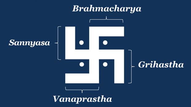 2) They Represent the Four Stages of Life: Clockwise from top: Brahmacharya, Grihastha, Vanaprastha, Sannyasa. These are the four ashrama, or stages of life. When you are young you are in the brahmacharya stage, a student. After that comes the householder stage, grihastha. Then later in life comes vanaprastha, where you become a retired elder. Finally, a renunciation of material comforts and desires takes over during the final stage of sannyasa. Some people, after going through the brahmacharya stage, devote their entire lives to spiritual pursuits and enter sannyasa then.