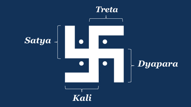 4) They Also Can Be Taken to Represent the Four Yugas: In Hinduism, time is conceived of both cyclically and over vast epochs. These can be mapped onto the arms of the swastika (clockwise from left) as Satya Yuga, Treta Yuga, Dvapara Yuga, and finally Kali Yuga. The latter is both the shortest of the ages, and the one which we are now in.