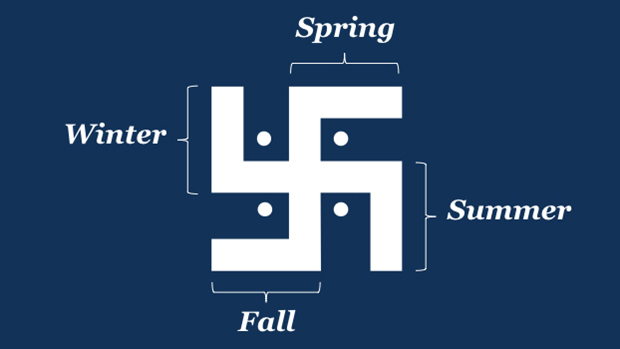 5) The Four Seasons: Though not everyplace on Earth experiences the seasons in the same way and some places translate the procession of the year’s natural phenomena in different terms, the four limbs of the swastika can also be taken to represent winter, spring, summer, fall. The procession of the seasons mirroring the procession of the stages of life.