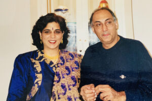 But no one wants to sit around in a sari all day, hungry and waiting for the moon to rise. So after school, all of us children would join our moms at the designated house with fathers joining later on after the workday was done. That’s when all of the moms would change into salwar kameezes (Indian pantsuits for women) or Indian fusion outfits to prepare for the puja as seen by the picture below of my parents in 1998.