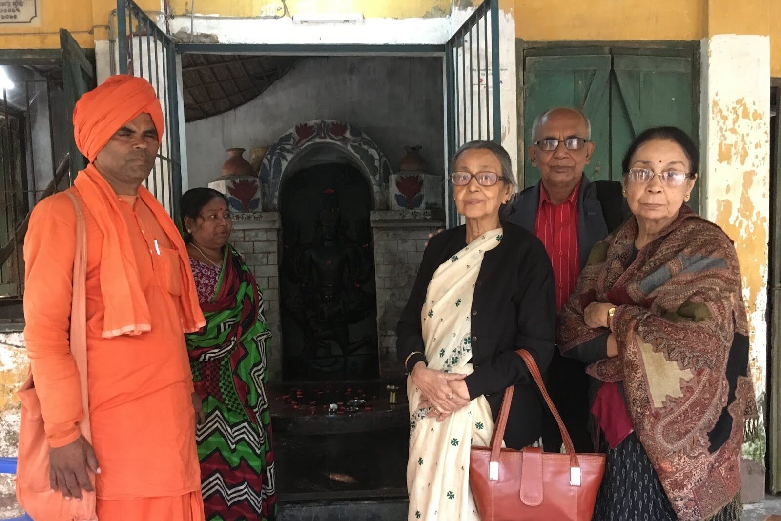 Dr. Sachi Dastidar (second from right) and others stands outside a 15th-century Vishnu temple in the Barisal District of Bangladesh. Its original structure damaged during the pogroms of the 1950s, the deity now sits in a poorly constructed shed with leaky windows and doors.