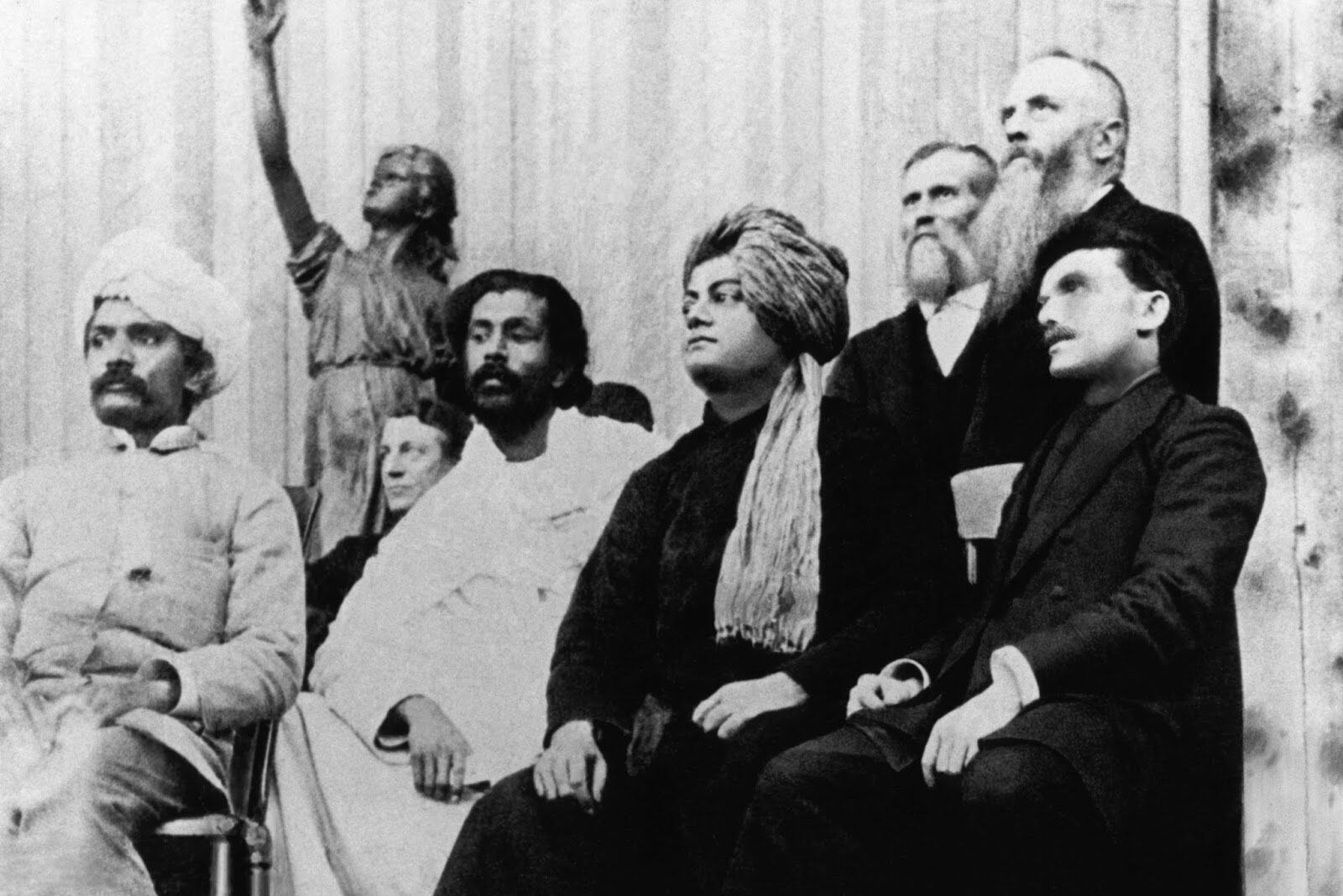 Wearing a flowing red turban complemented by yellow robes fastened with a scarlet sash, the 30-year-old Indian monk, exuding dignity and elegance, captured the attention of the 7,000 present, addressing them in astonishingly refined English.